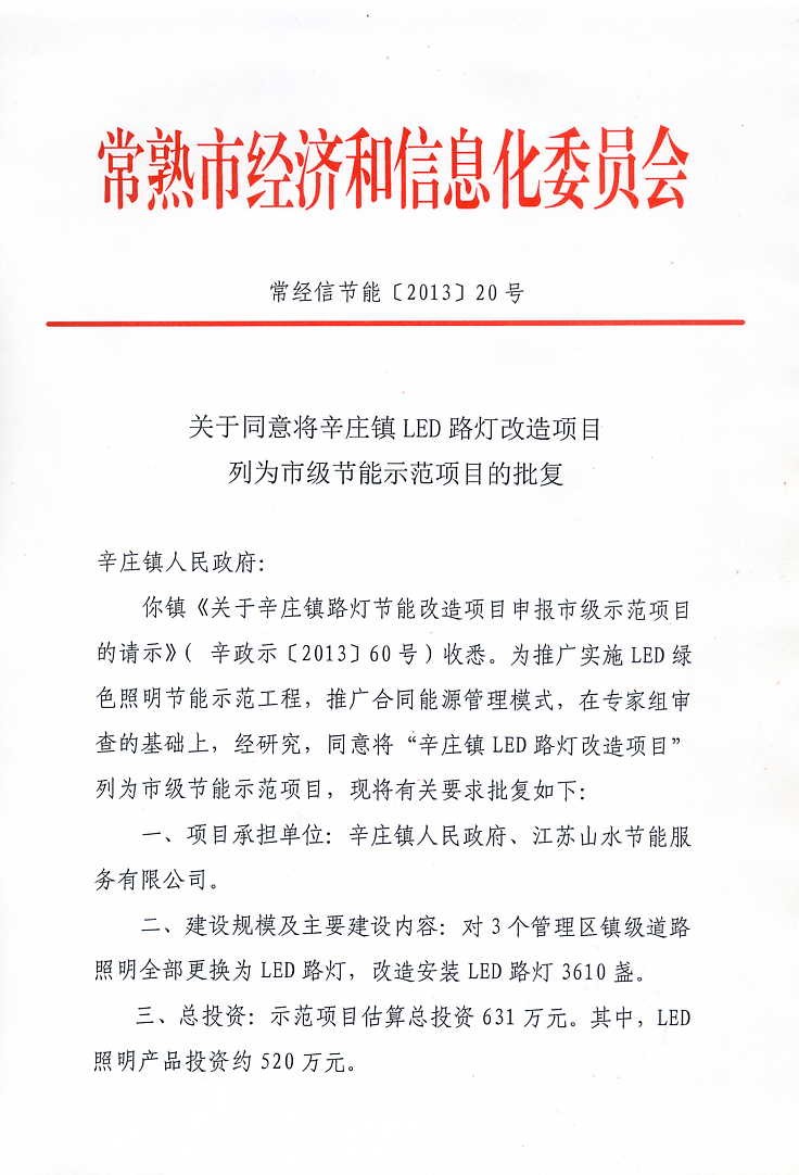 根据常熟市经济和信息化委员会的常经信节能(2013)20号文件,关于同意将辛庄镇LED路灯改造项目列为市级节能示范项目的批复,其中指出为推广实施LED绿色照明节能示范工程,推广合同能源管理模式,在专家组审查的...